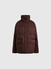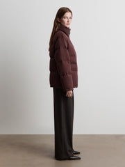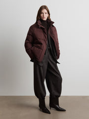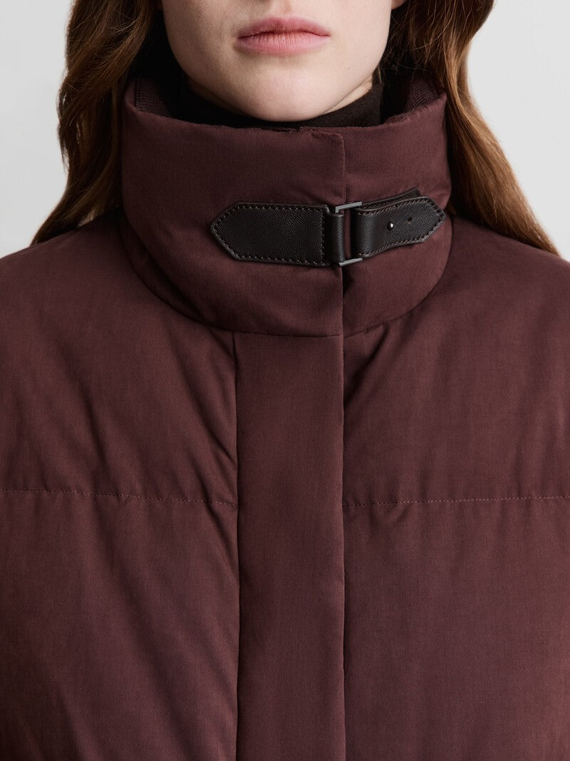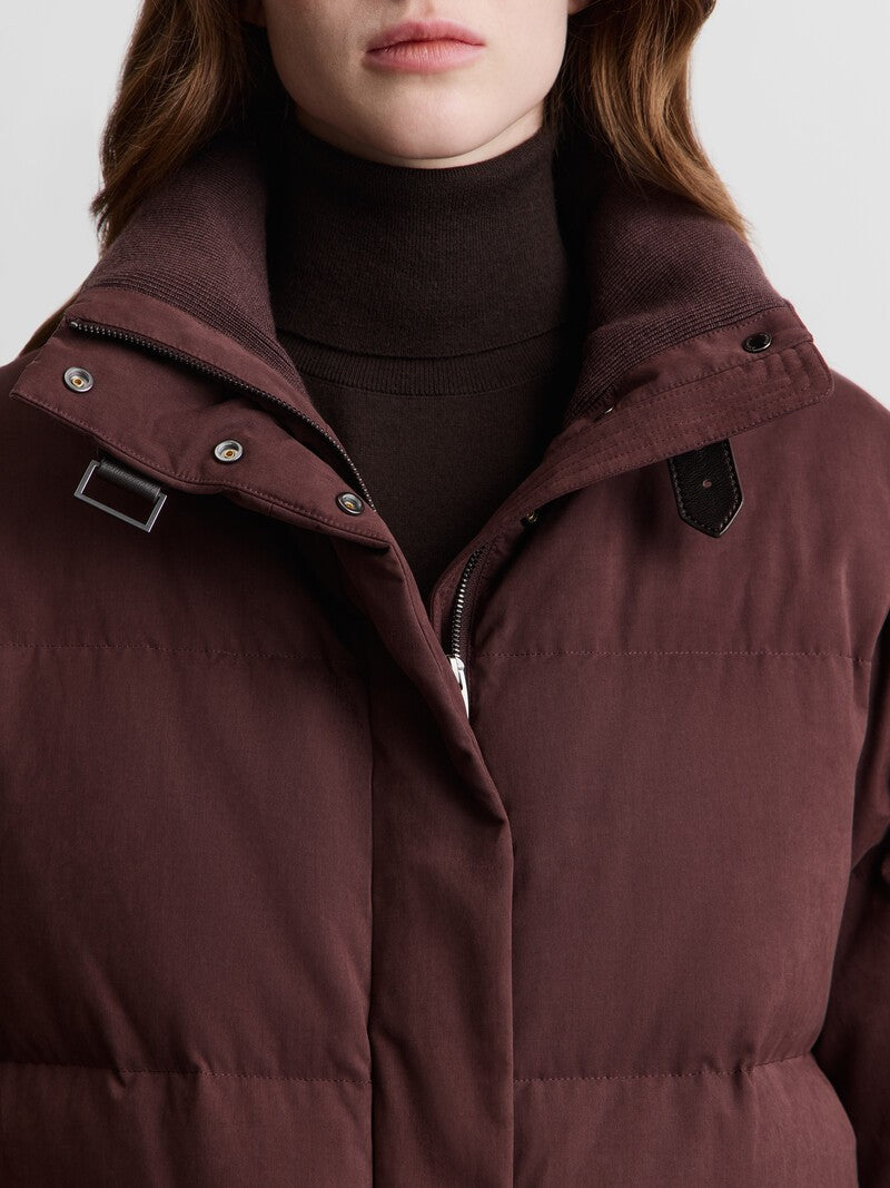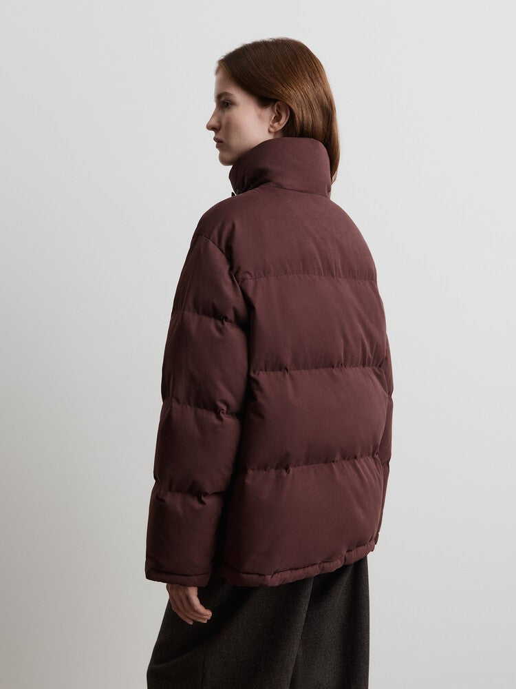 Новинка нашей коллекции — плотно набитый пуховик из бархатистой хлопковой ткани с элементами из натуральной кожи. Уютный округлый силуэт, высокий воротник, манжеты из мягкой мериносовой шерсти, подкладка из микрофлиса в карманах — каждая деталь обещает, что зима будет приятной. Мы используем здесь ткань от нашего корейского поставщика — эксперта в разработке технологичных материалов на натуральной основе.