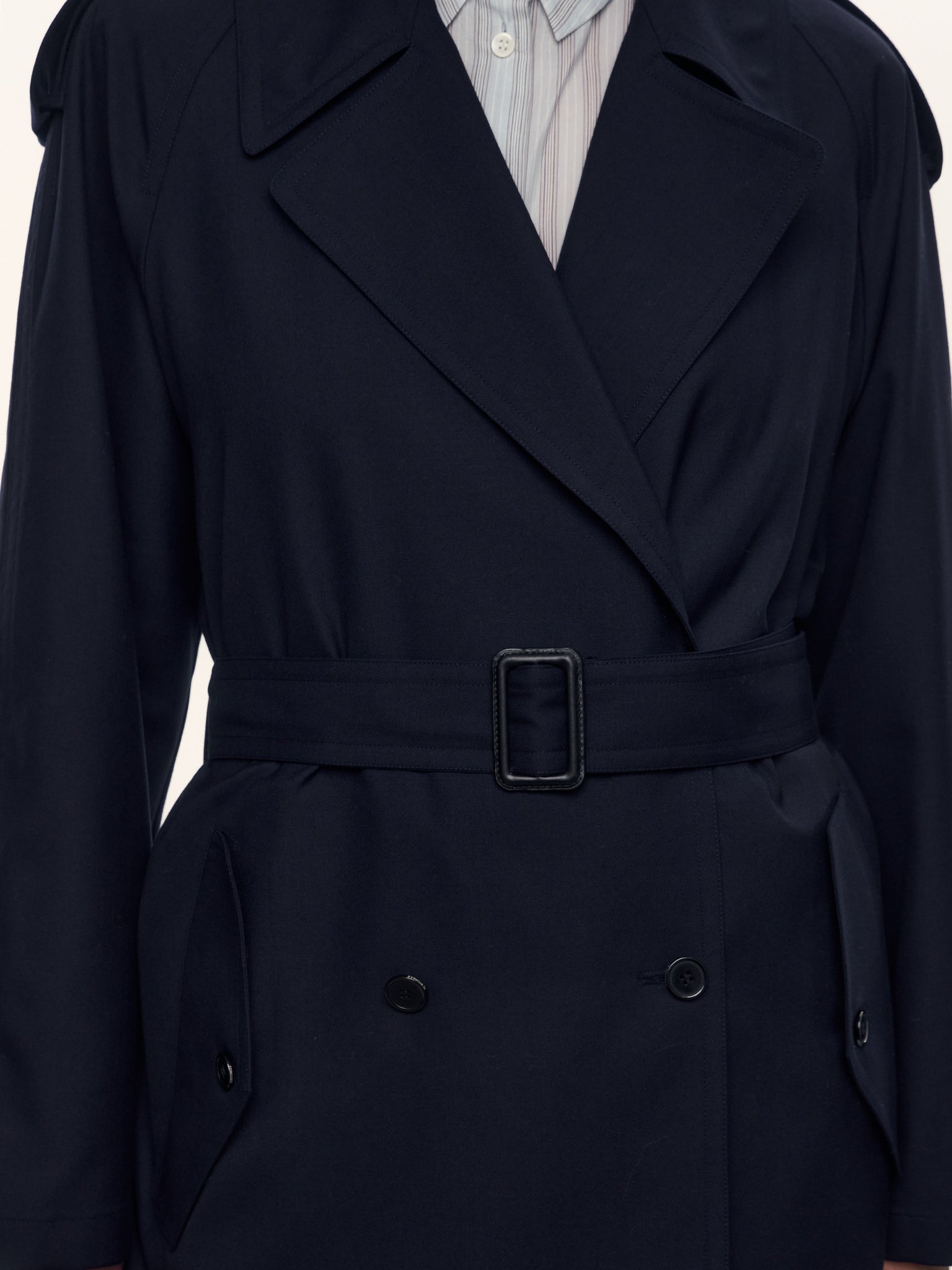 3. Пояс с пряжкой из натуральной кожи и широкие лацканы воротника создают хрупкий силуэт