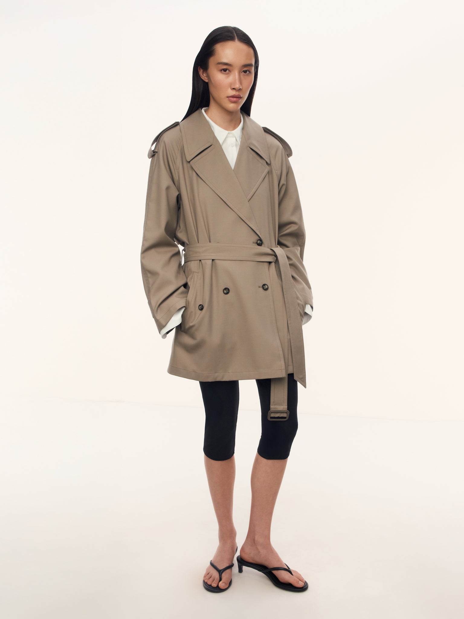 3. Пояс с пряжкой из натуральной кожи и широкие лацканы воротника создают хрупкий силуэт