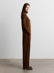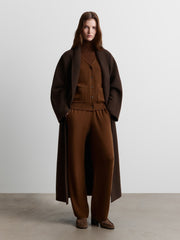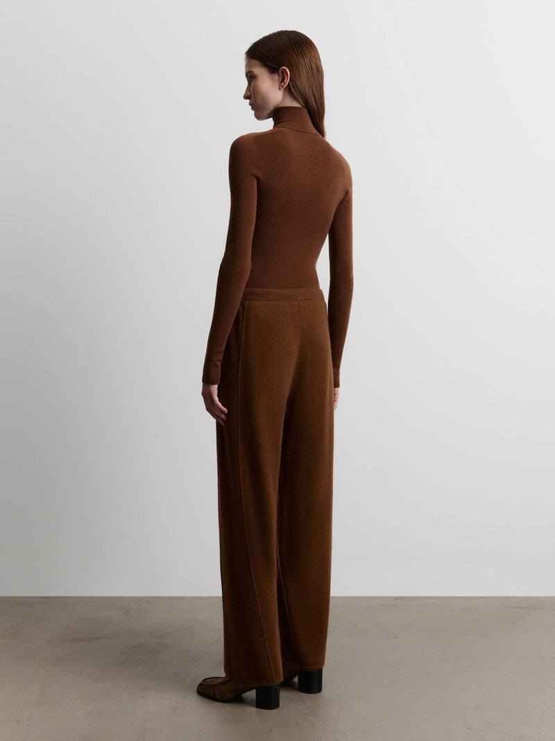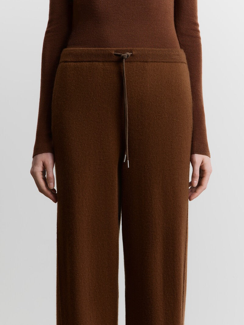 Теплые легкие брюки из нежного и легкого кашемира — в таких прогулки по осеннему городу станут еще приятнее. Мы сделали их слегка укороченными — так удобнее носить их с высокими ботинками, и дополнили пояс замшевым шнурком — посадку будет просто отрегулировать.