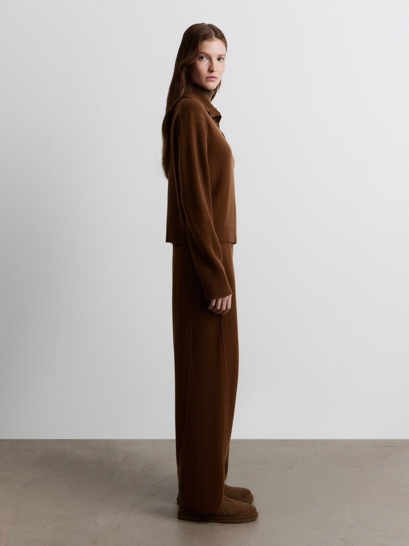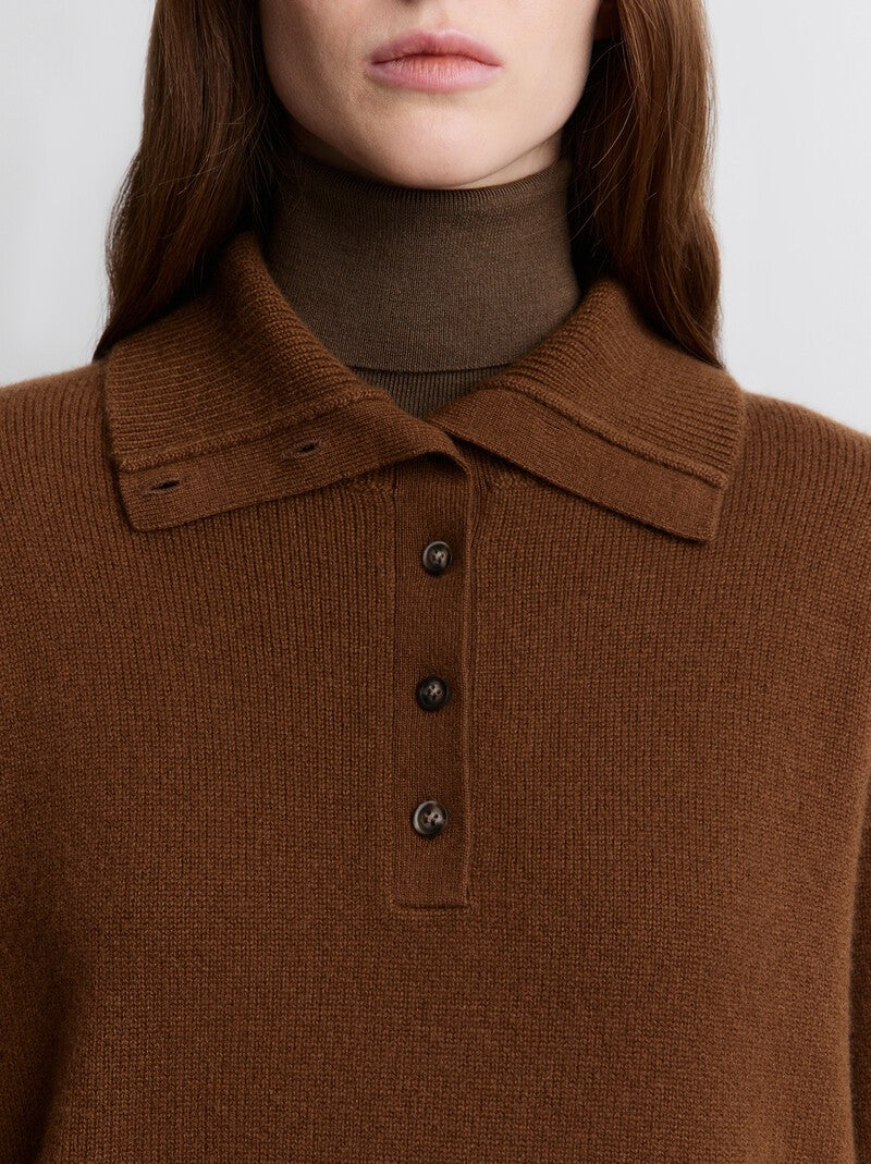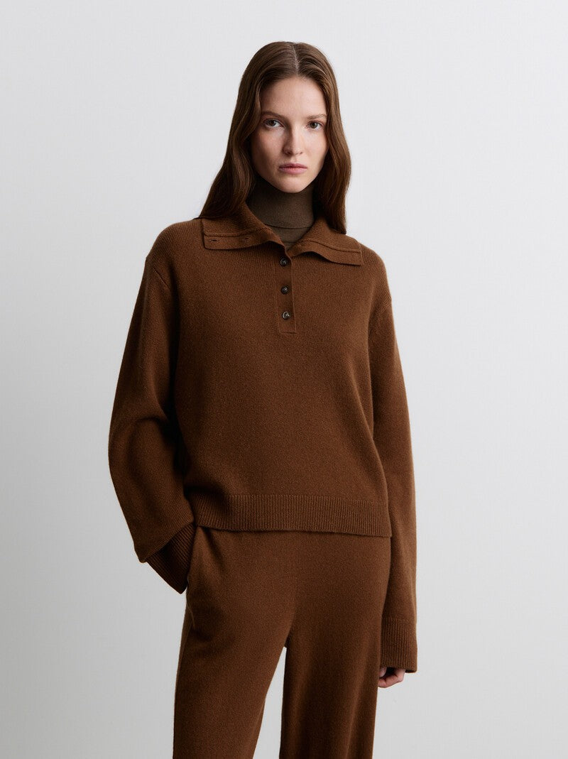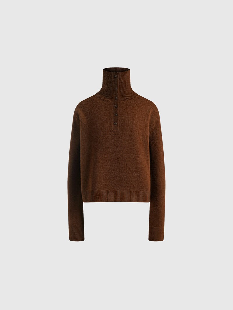Новинка в нашей коллекции — кашемировый джемпер с высоким воротником, который с помощью пуговиц можно сделать отложным. Теплый и легкий, он связан в две нити из нежной, пушистой пряжи — пуха кашмирских коз, обитающих на высокогорных плато Внутренней Монголии.
