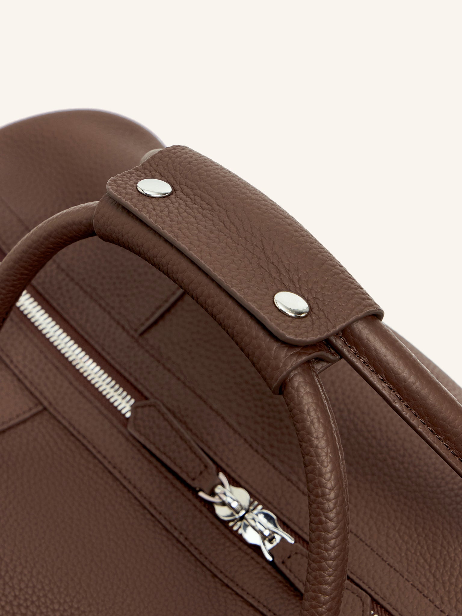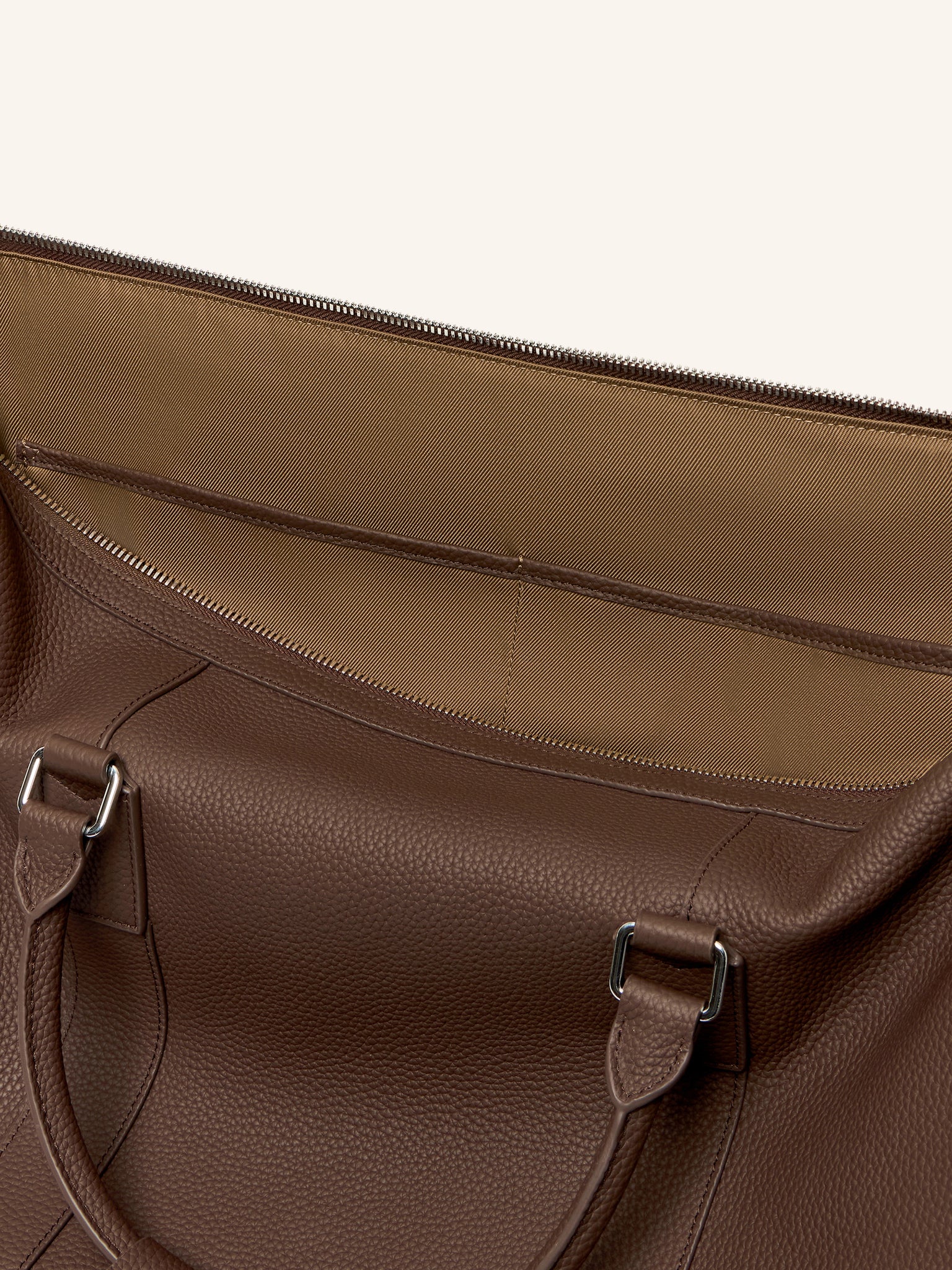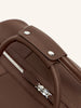 Две ручки легко соединить фиксатором, а кожаная деталь на плечевом ремне из широкой стропы не позволит ему соскользнуть. Застегивается на надежную двухзамковую молнию.