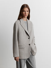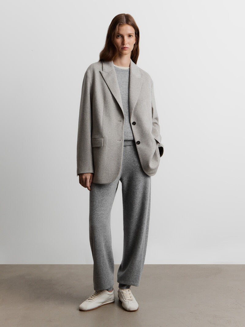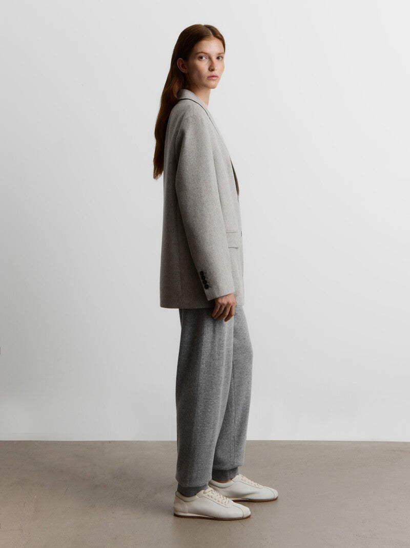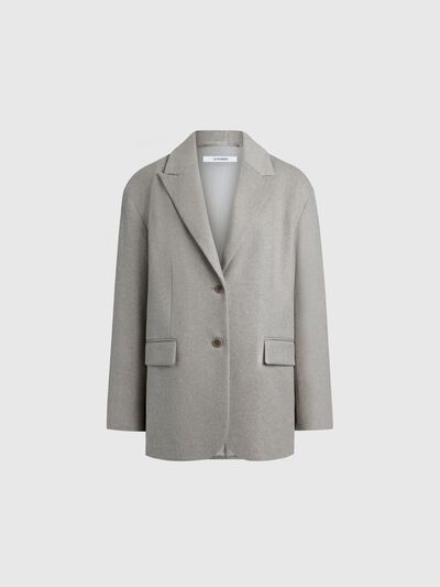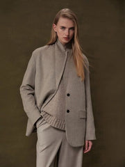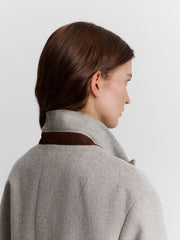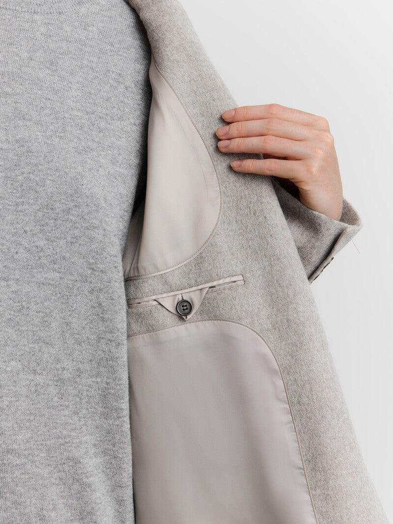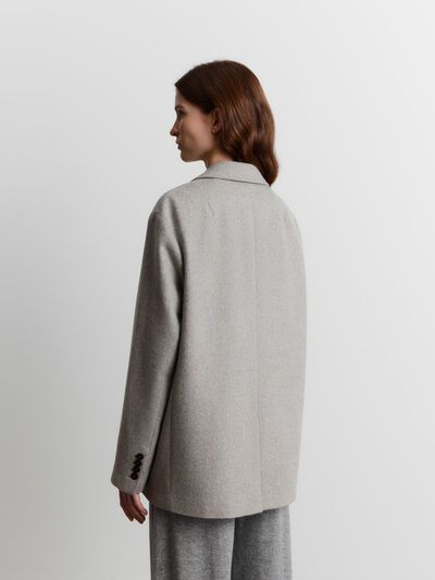 Свободный прямой жакет — альтернатива легким пальто. Мы выбрали для него уютную ткань из шерсти и пуха ангорского кролика, который получен максимально бережным способом. Снаружи стойку воротника дублирует замшевая деталь, а мягкую подкладку мы сшили из шелковистой купро.
