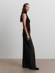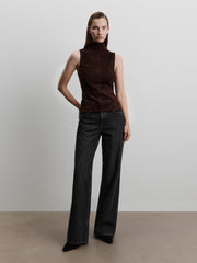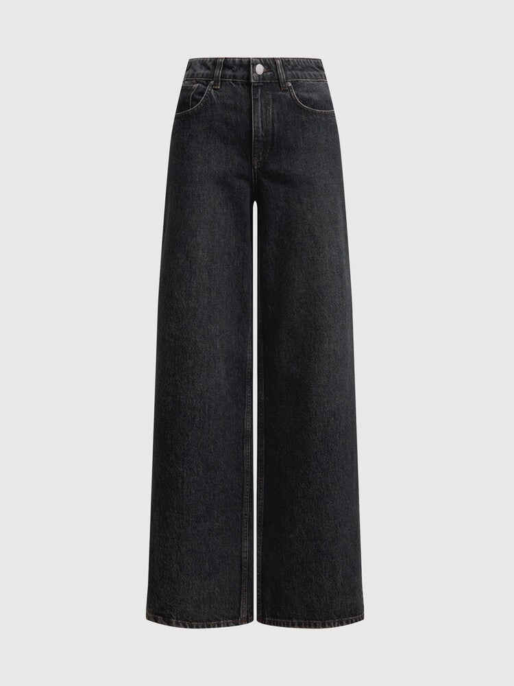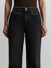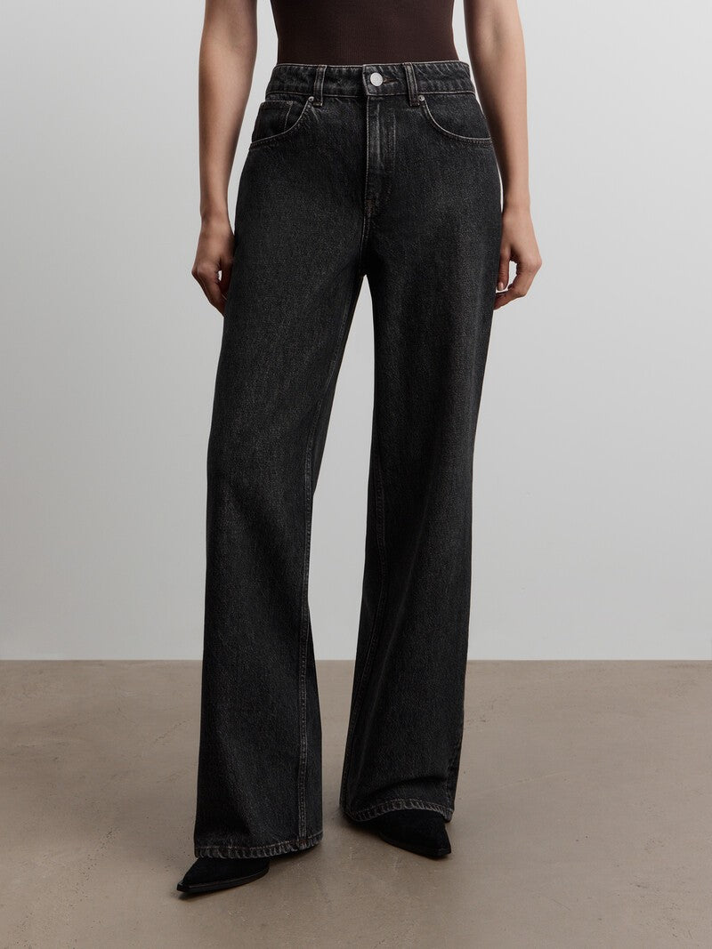 Широкие длинные джинсы с высокой посадкой — уже классика. Такие джинсы визуально удлиняют силуэт, но если хотите усилить эффект, дополните образ обувью на каблуке. Материал — прочный и долговечный деним плотностью 14,5 Oz c выраженным рубчиком. Застегиваются на молнию и дополнены патчем из натуральной кожи.