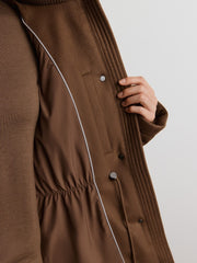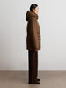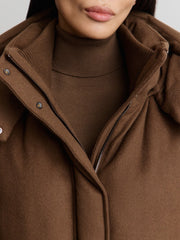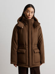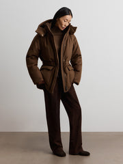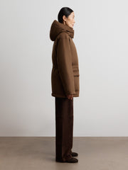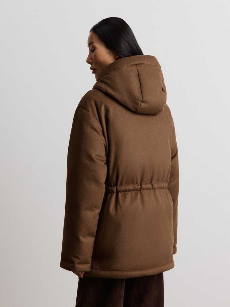 Для этого пуховика мы выбрали необычную ткань — очень мягкую смесь ангоры и мериносовой шерсти, с небольшим нежным ворсом и пропиткой от влаги. Утиный пух, вязаные детали из мериносовой шерсти и капюшон на кнопках помогут сберечь тепло и защитят от ветра. С помощью кулиски на поясе можно сделать силуэт прямым или подчеркнуть талию.