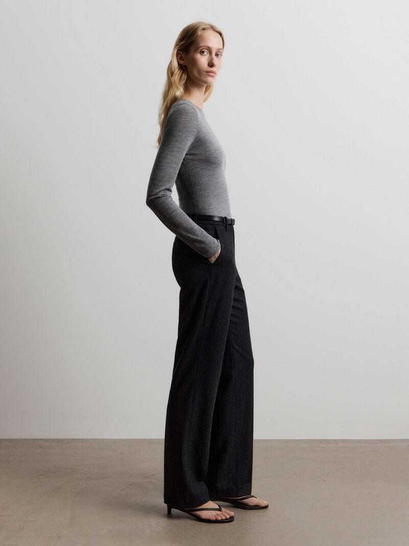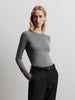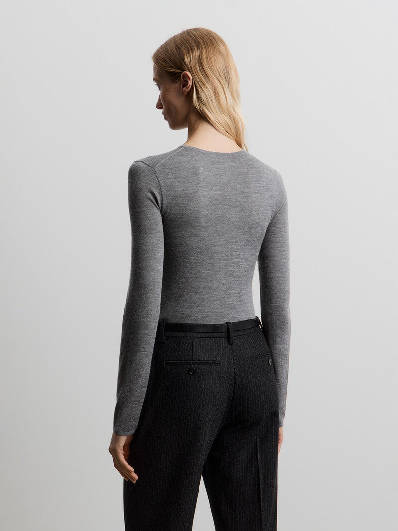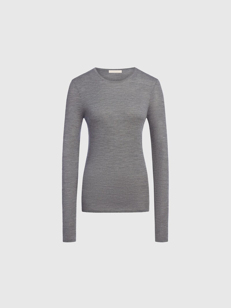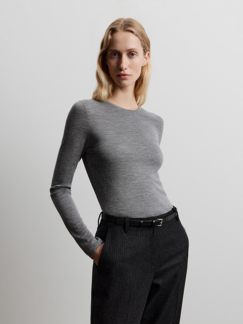 Для этого лонгслива мы выбрали нежную тонкую пряжу, в которой сочетаются шерсть мериноса, шелк и кашемир. Такая пряжа не часто встречается в коллекциях брендов из-за высокой стоимости — одежда из нее окутывает тело невесомым теплом в период остывающего лета и легко сочетается с другими вещами зимой. Полупрозрачный трикотаж с деликатным блеском связан крошечными петлями и может слегка просвечивать.